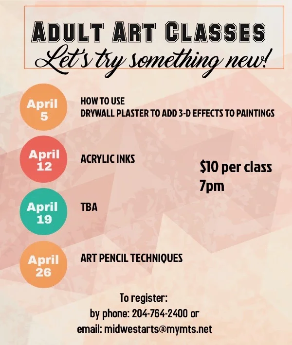 Another round of Adult Art Classes will be starting Thursday April 5th. You can sign up for classes individually or as a set. Come try something new with us!